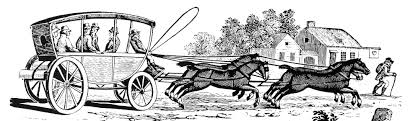 Since the coach was due at the nearest coaching inn at 10:AM, we were obliged to set out at 5:30. Like my Father, I was an early riser, but my mother was quite peevish about the hour of departure. There was not much she could do about it, as the horses and coach could only do 10 ½ miles per hour carrying us and our trunks. Bulstrode, the driver, did not add much to the joy of the occasion. He was sullen at the best of times, but getting up at 3 to harness and load the coach, drive the 9 hour round trip and put the horses to bed compounded his usual mood. My mother did not lighten the load. Despite the cold wind, the frosty coachman, the jolting carriage, the brief rain and snow squalls and my mother's grumbling and bickering it was a glorious day. We saw only two other travelers along the rode. A solitary horseman came trotting down the road behind us, cursed our carriage, whipped our horse and swore at Bulstrode and rode on.